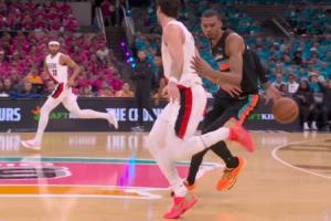 站帽來(lái)了……格蘭特激情對(duì)抗文班后倒地 文班原地長(zhǎng)臂站帽