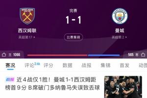 3月15日,曼城客場1-1戰(zhàn)平西漢姆聯(lián),同輪阿森納2-0擊敗埃弗頓。曼城在少賽一場的情況下落后阿森納多達9分。